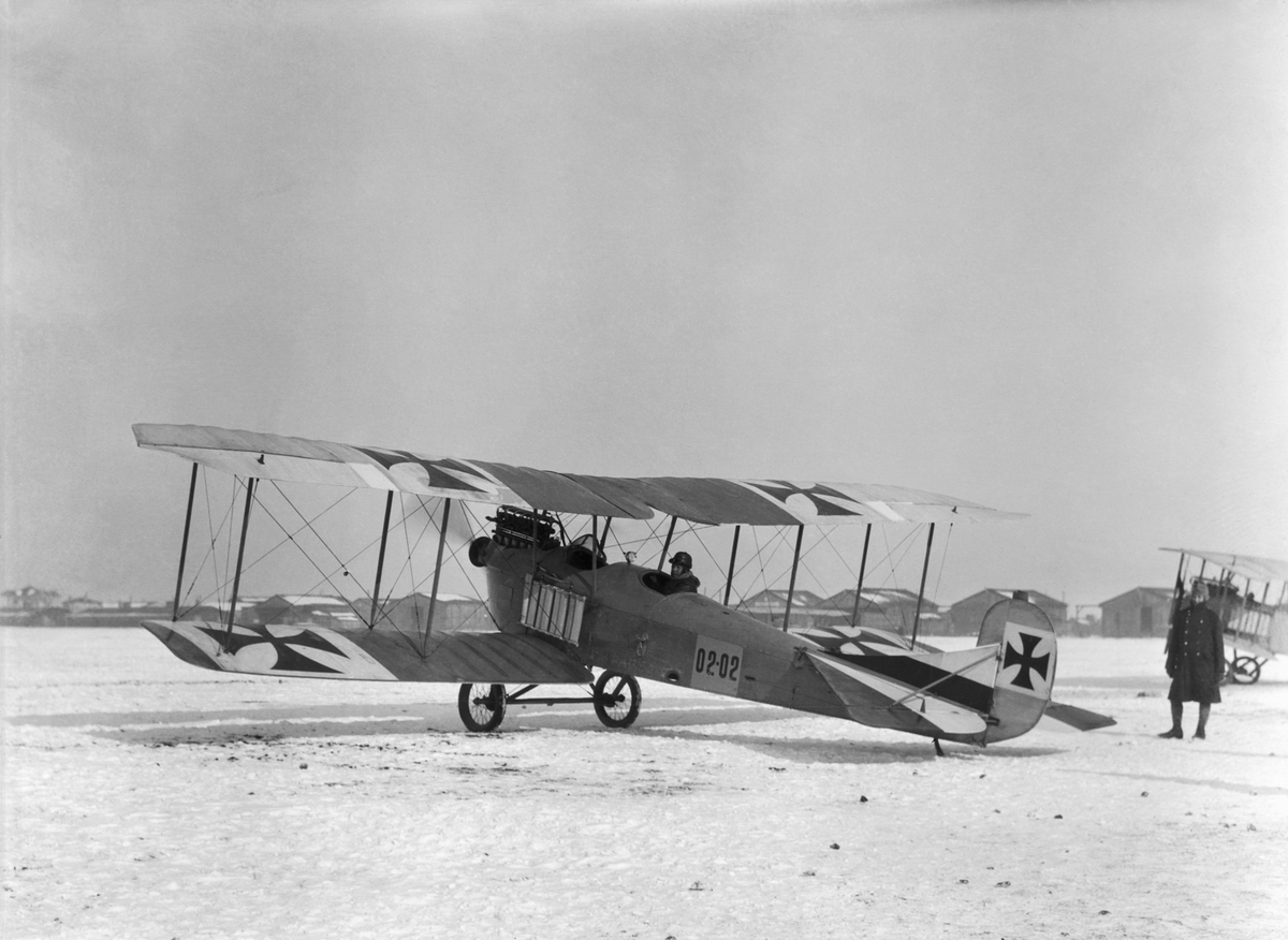 Militärt flygplan Albatros B.II märkt 02.02 tillhörande Österrike-Ungern står på ett fält, vintertid. En man sitter i flygplanet, en militär står bredvid. Flyghangarer i bakgrunden. Vy bakifrån.