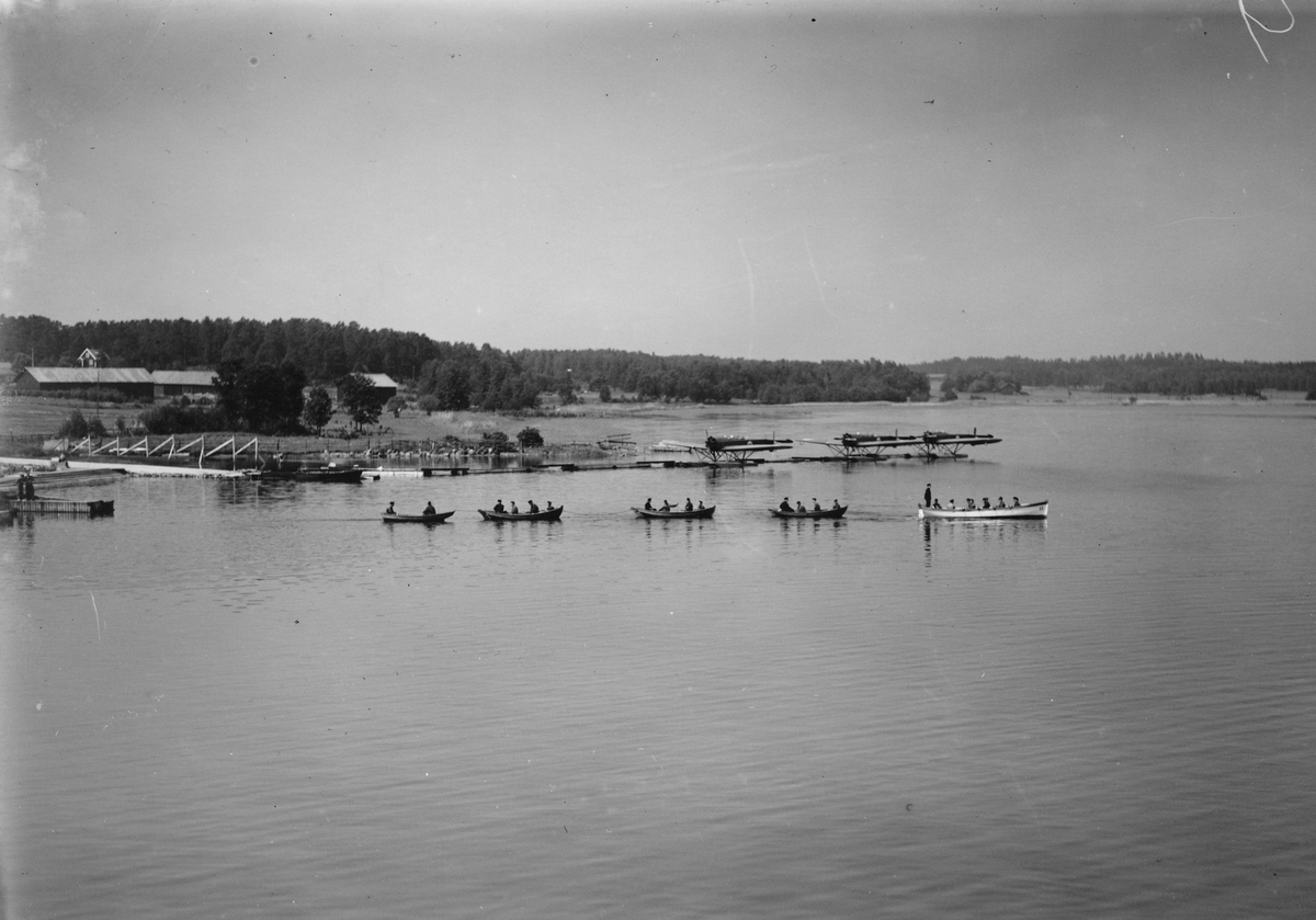 Roddbåtar utanför F 2 Hägernäs, 1937. I bakgrunden syns flottiljområdet samt tre flygplan S 5.
