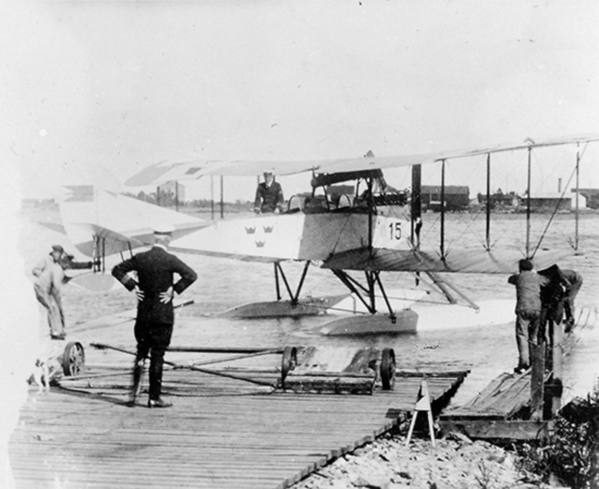 Flygplan Thulin G vid slip. Personer i färd med att dra ut flygplanet på vattnet. I förgrunden står Arvid Flory.