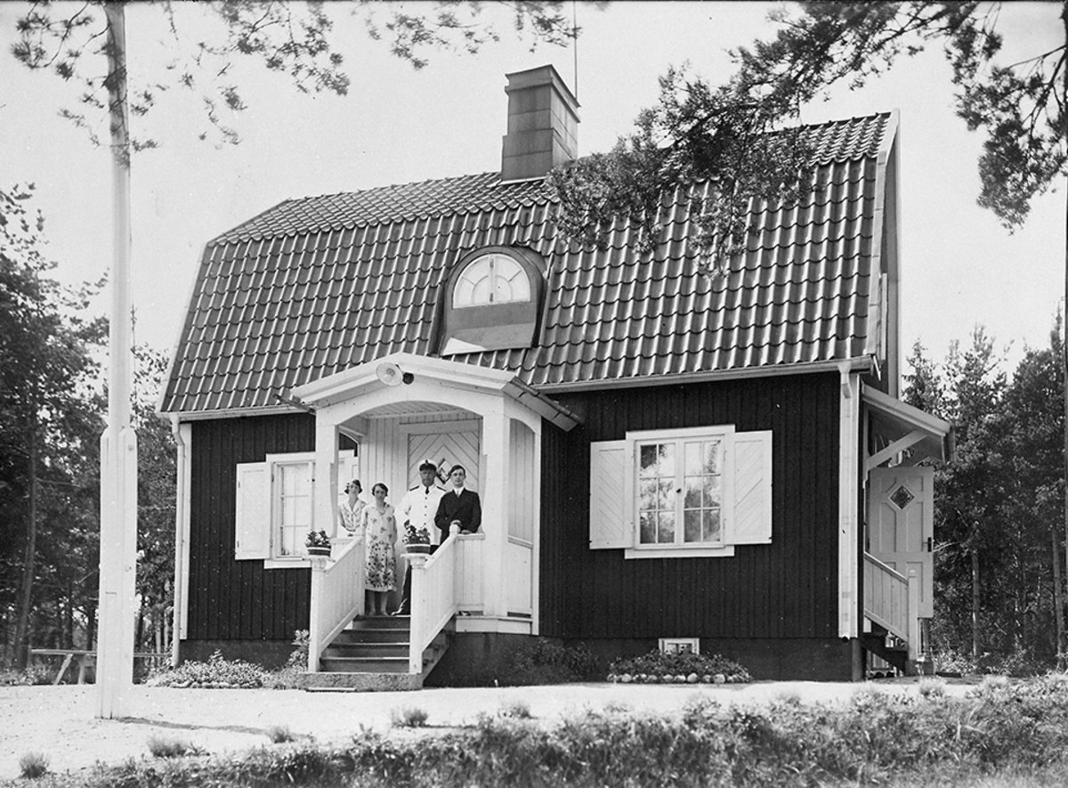 Grupporträtt. En familj står på verandan till tjänstebostad på F 2 Roslagens flygflottilj.