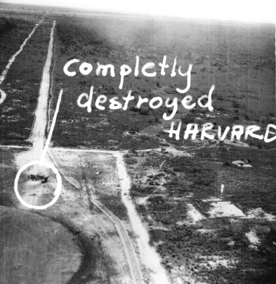 Flygspaningsbild av sönderskjutet kantangesiskt flygplan Harvard T-6 i vid flygbana taget av F 22 under Kongokrisen 1962-1963. Med påritad text "Completly destroyed Harvard".