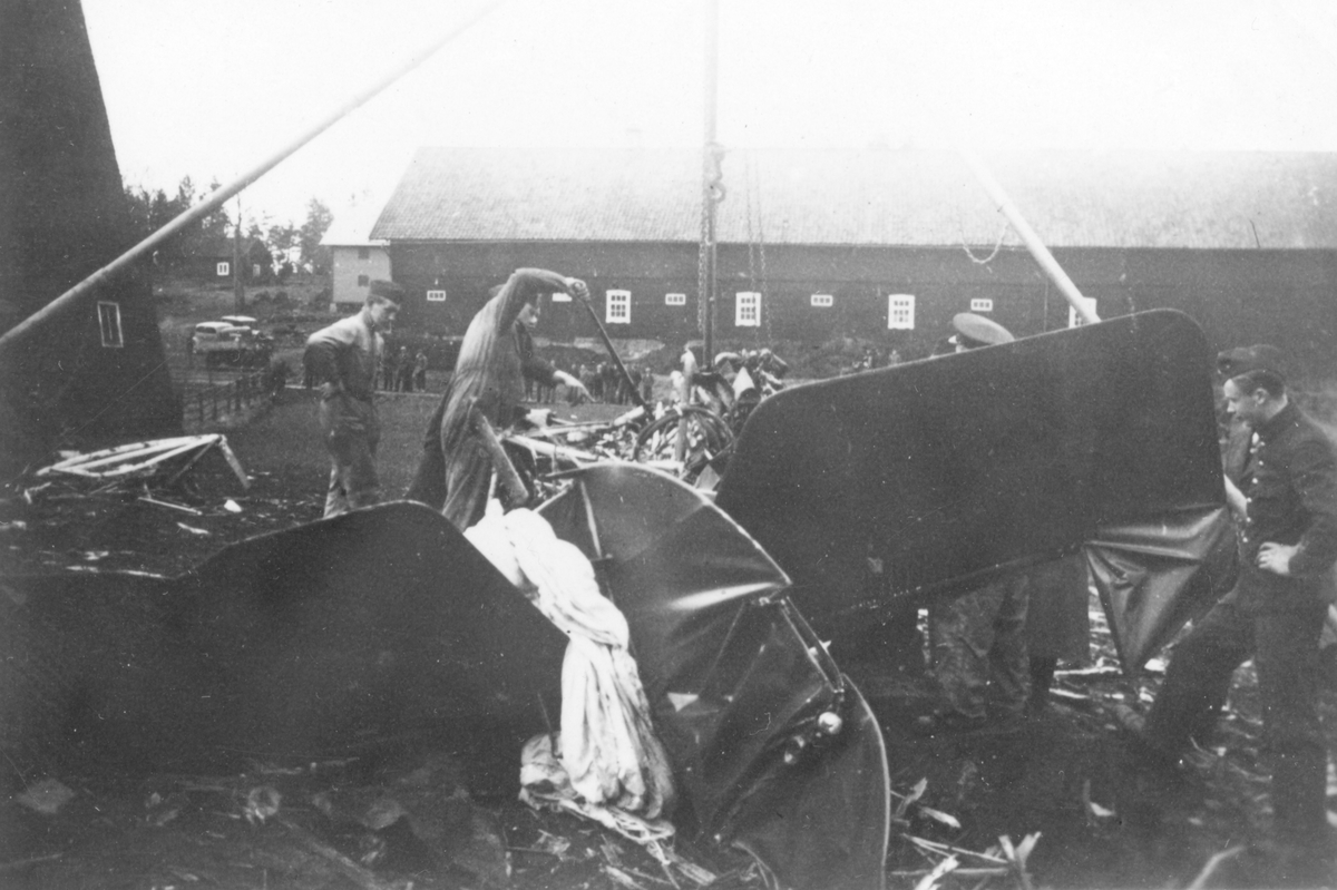 Sortering av rester av havererat militärt flygplan. Militärer i arbete.