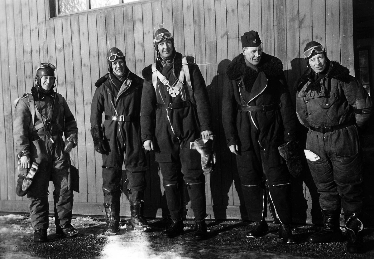 Grupporträtt av fem militära flygare i flygdräkt framför en hangarport, vintertid. 1930-tal.