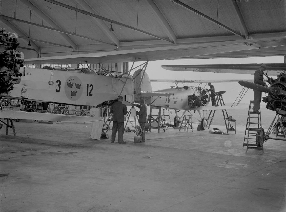 Montering / underhåll av flygplan S 6 samt B 4 på CVM, Centrala verkstäderna Malmslätt. Arbete i hangar.