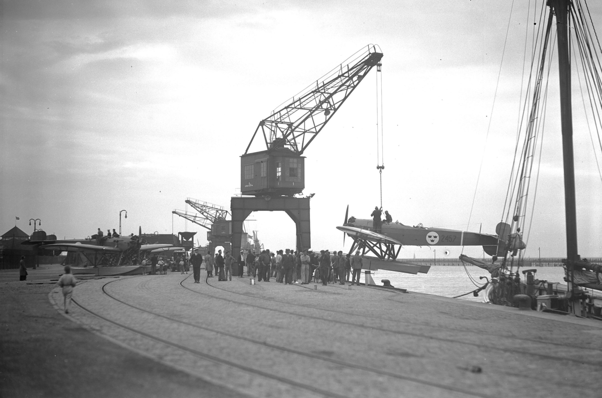 Flygplan S 5 lyfts av lyftkran från vattenytan till Malmö hamn, 1934. Folksamling på kaj.
