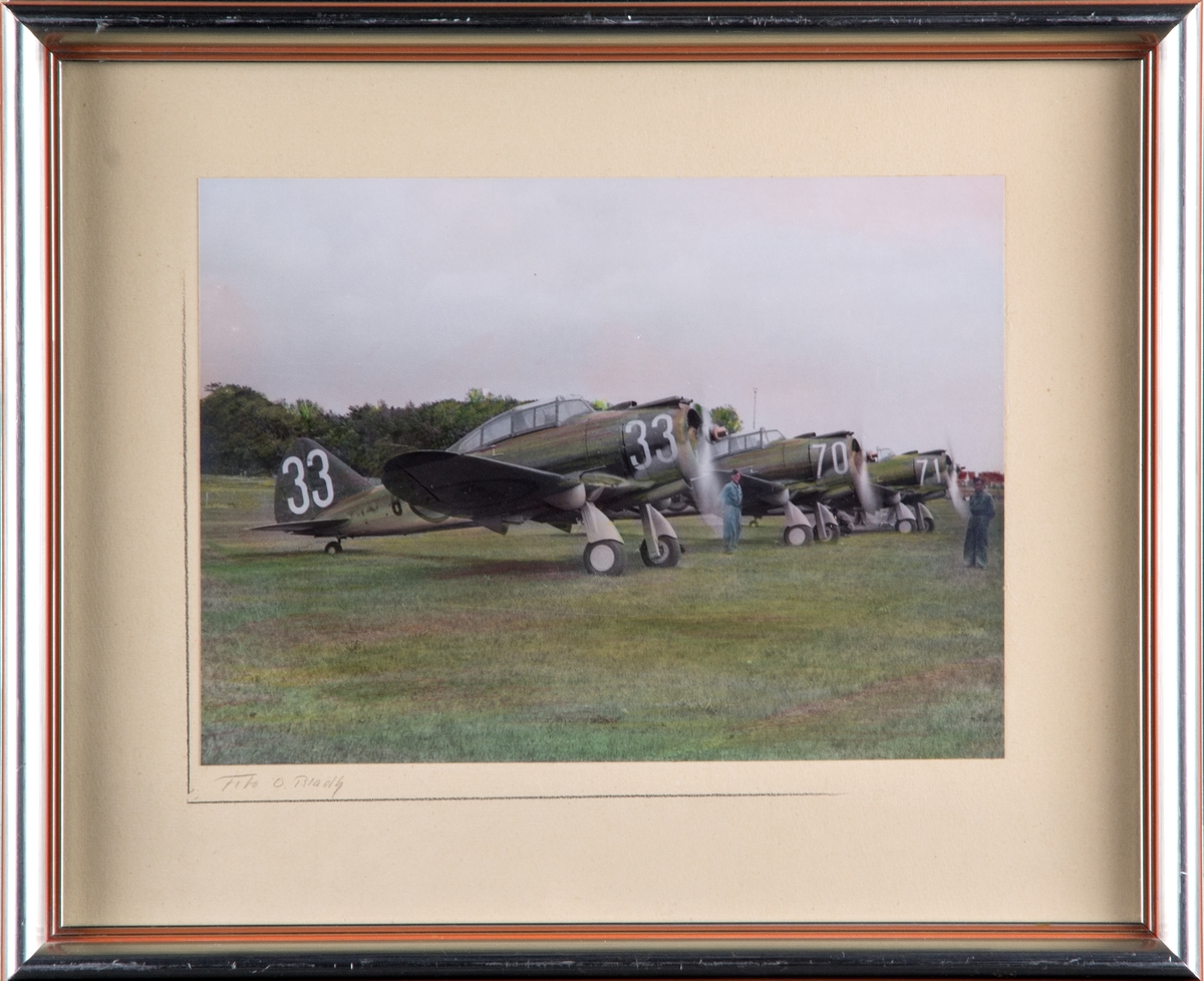 Tre stycken flygplan J 9 från F 8 Svea flygflottilj motorkörs på ett flygfält. Flygtekniker i närheten. Flygplanen är märkta med nummer 33, 70 och 71. Inramat foto. Kolorerat foto.