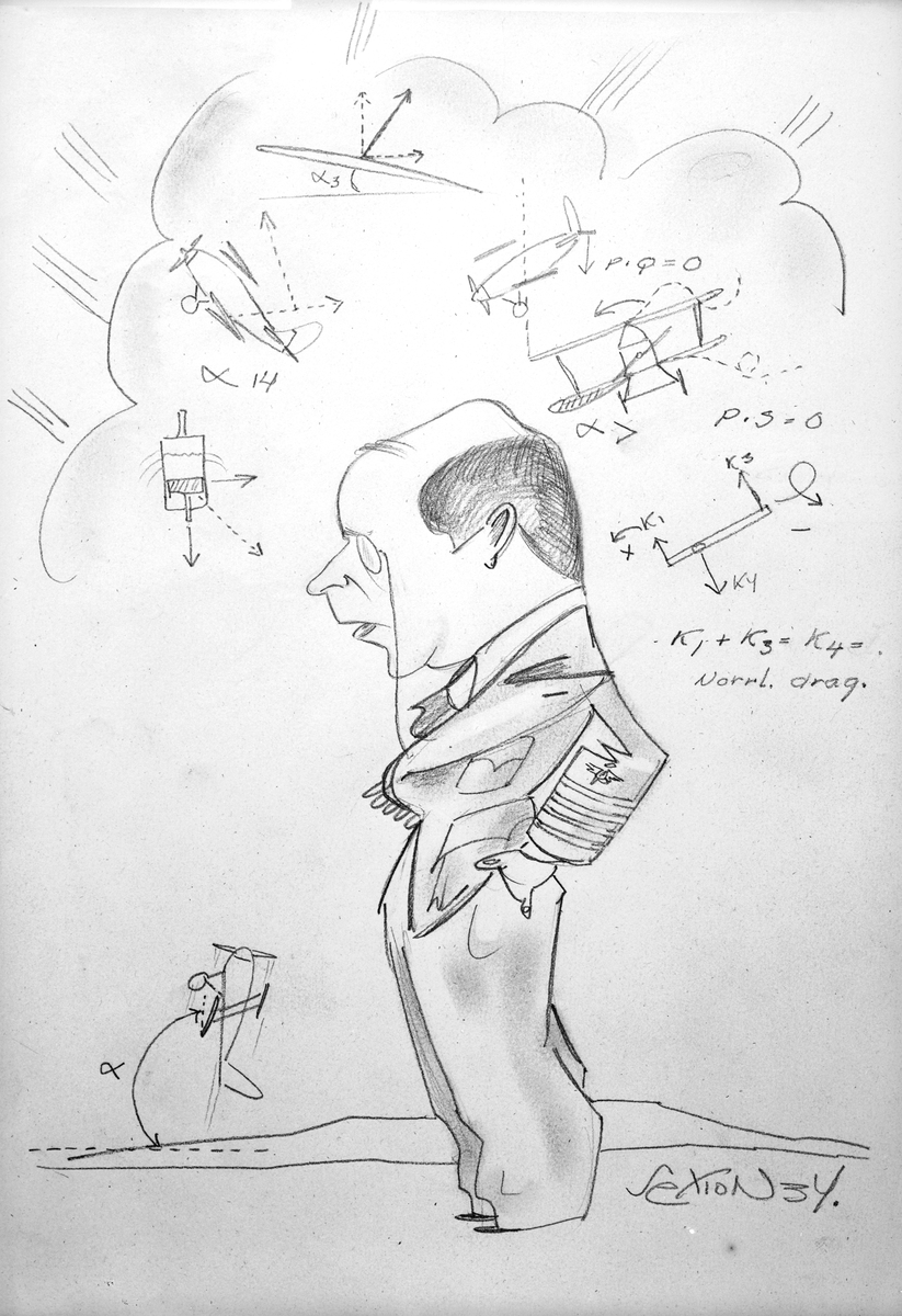 Karikatyrbild av överstelöjtnant Gösta von Porat ur flygvapnet vid F 3 Malmen. Avfotograferad teckning.
