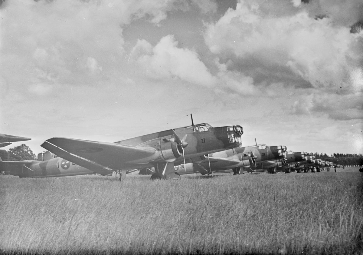 Flygplan B 3 på marken vid flygdag på F 3 Malmen, 1938. 8 stycken flygplan på linje.