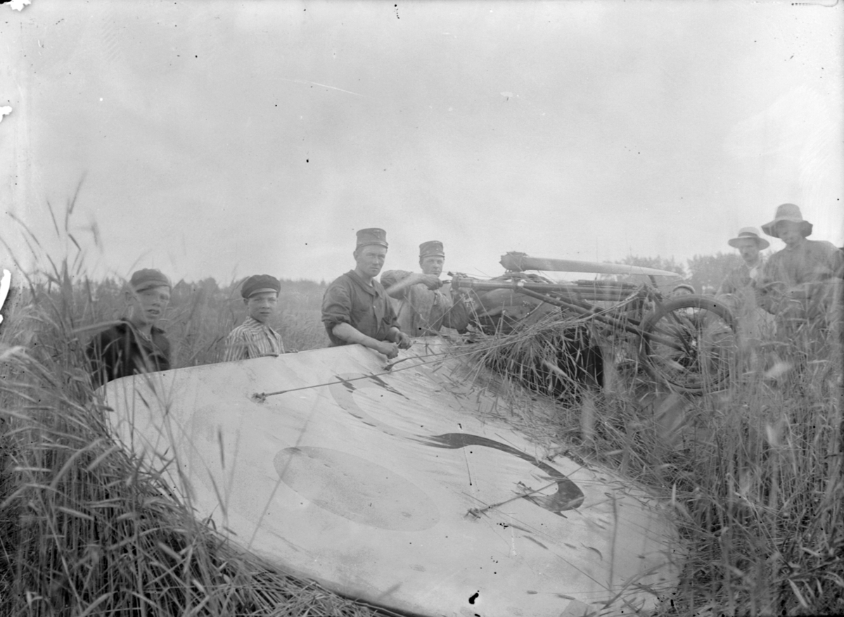 Ett havererat flygplan Thulin Typ A på Malmen. Folksamling vid flygplanet.