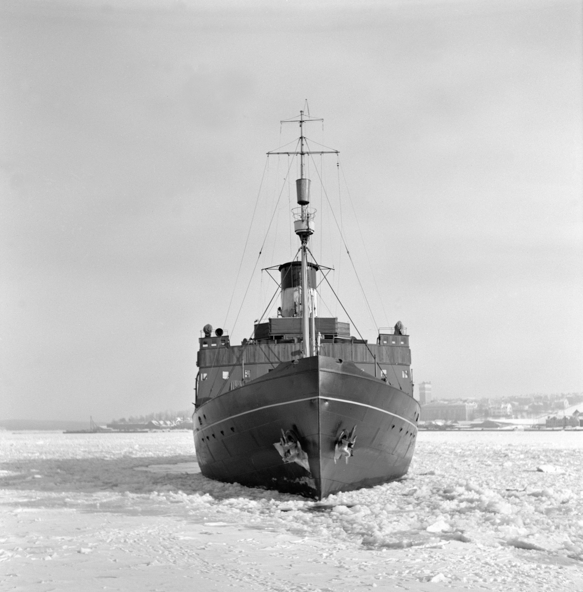 Fartyg i Härnösands hamn vid bärgningsförsök av nödlandade flygplan B 18 efter flygning i hårt väder i februari 1946.