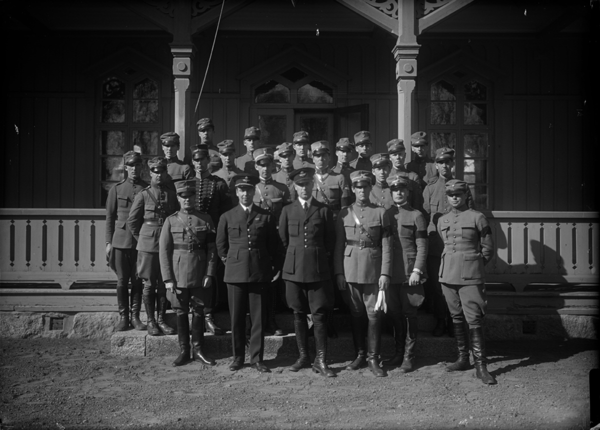 Grupporträtt. Arméspanarkursen på F 3 Malmen 1929-1930. Kursdeltagare uppställda framför officersmässen.