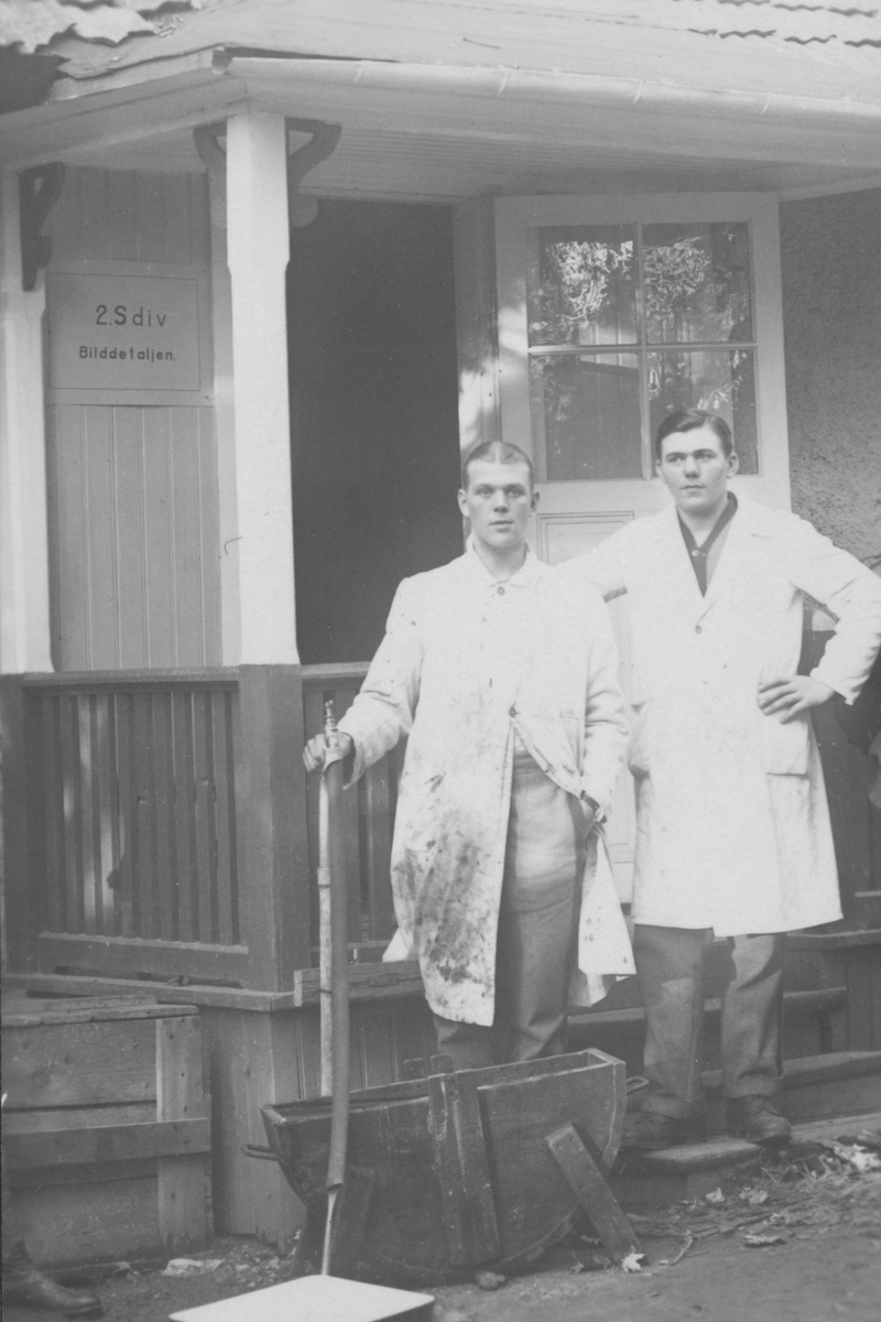 Grupporträtt. Två fotospanare tillhörande flygvapnet står vid ett framkallningskar utanför bilddetaljen på 2. spaningsdivisionen, F 3 Malmen.