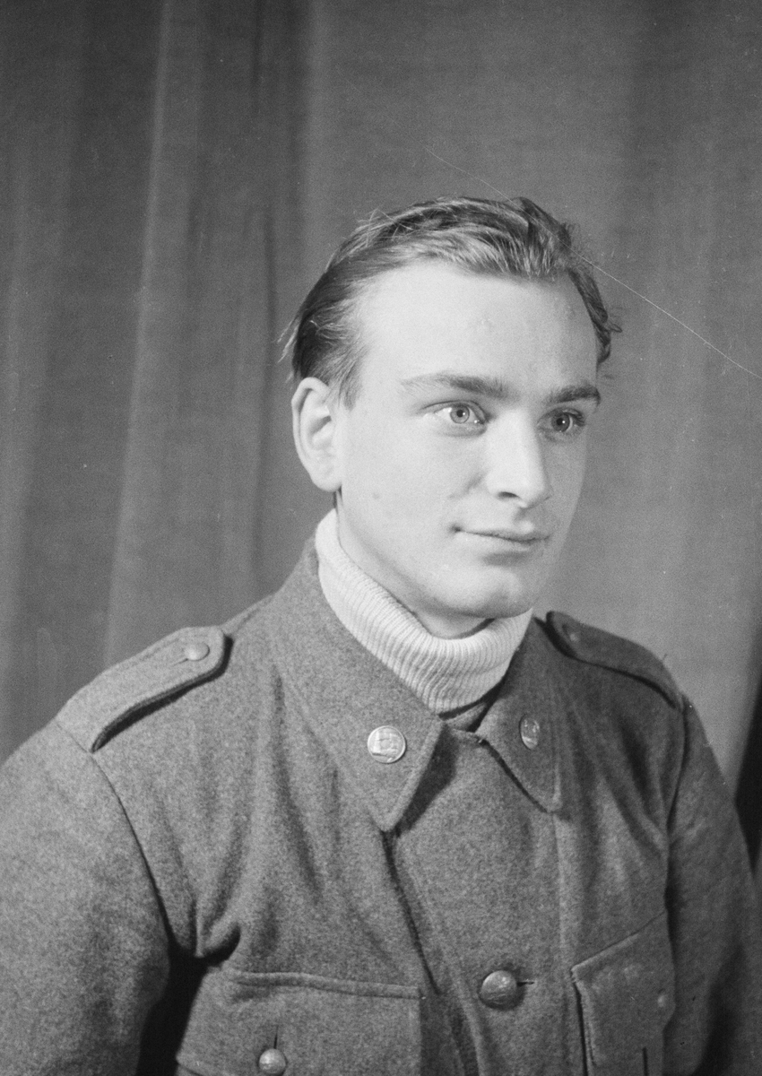 Porträttfoto av soldat Sven Åke Gustaf Karlsson (nummer 887), bilförare vid F 19, Svenska frivilligkåren i Finland under finska vinterkriget, 1940.