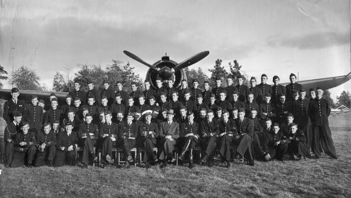Grupporträtt. Personal vid Första divisionen på F 6 Karlsborg, framför flygplan B 17.