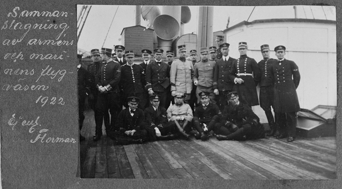 Gruppbild för marinens och arméns flygväsen, på däck på fartyget H.M.S. Freja.