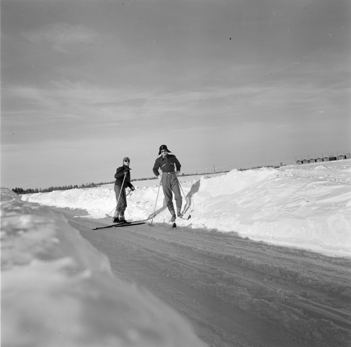 Två skidåkare på en väg vid F 19, Svenska frivilligkåren i Finland.