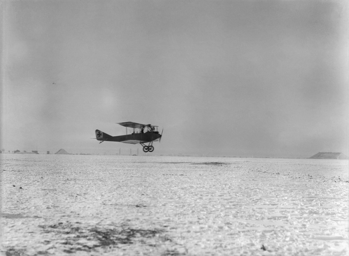 Militärt flygplan Albatros B.I tillhörande Österrike-Ungern lyfter från flygfält, vintertid. Vy snett bakifrån.