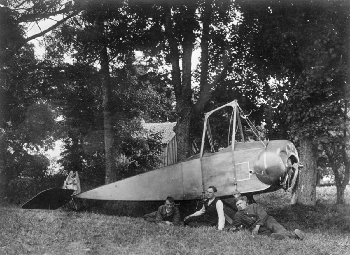 Isärplockat flygplan Thulin Typ E. Tre personer framförför flygplanskroppen.