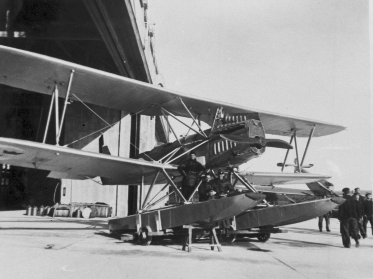 Flygplan Sk 4, Heinkel HD 24, med flottörer står uppställd på vagn utanför en hangar. Tre män står vid flygplanet.