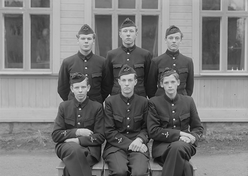 Volontärer på F 3 Östgöta flygflottilj, 1945-1946. Del av grupp, sex stycken unga män. Grupporträtt framför byggnad.