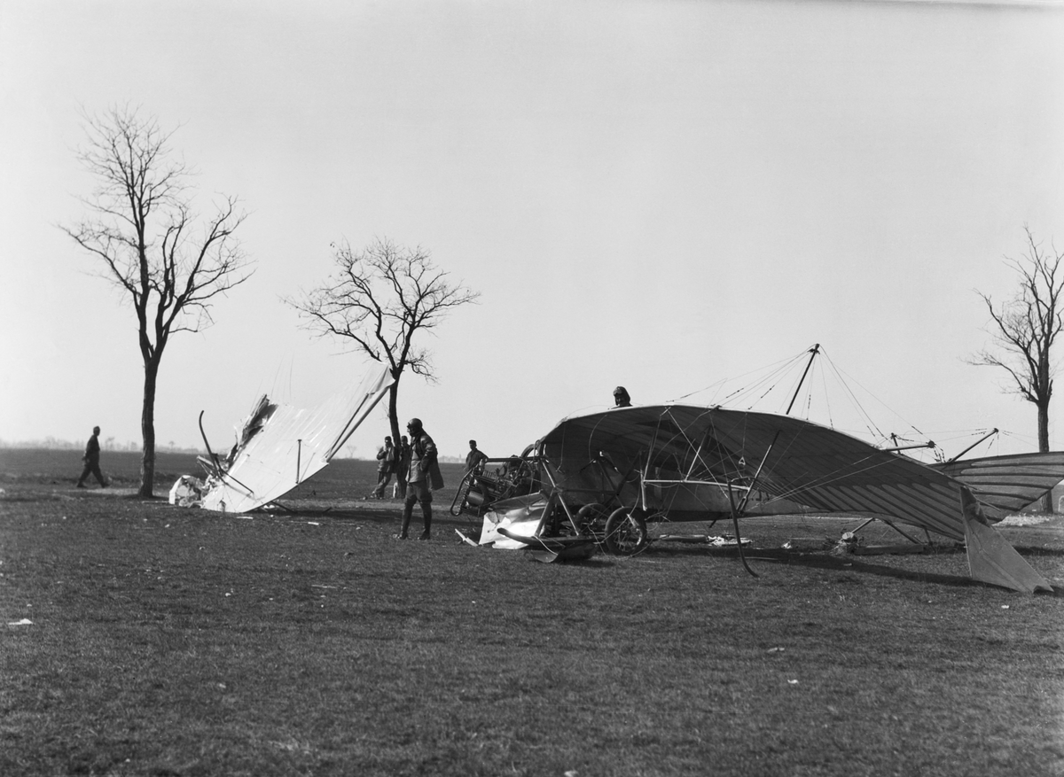 Havererat militärt flygplan Etrich Taube A.II tillhörande Österrike-Ungern ligger på ett fält vid träd. Militärer i rörelse vid flygplanet. Vy från sidan.