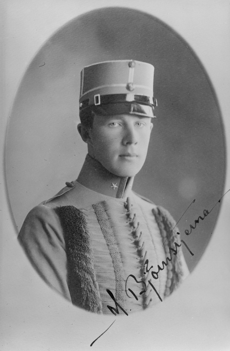 Porträtt av militära flygpionjären, Magnus Björnstjärna från Livgardet till häst. Porträttet är signerat av Björnstjärna.