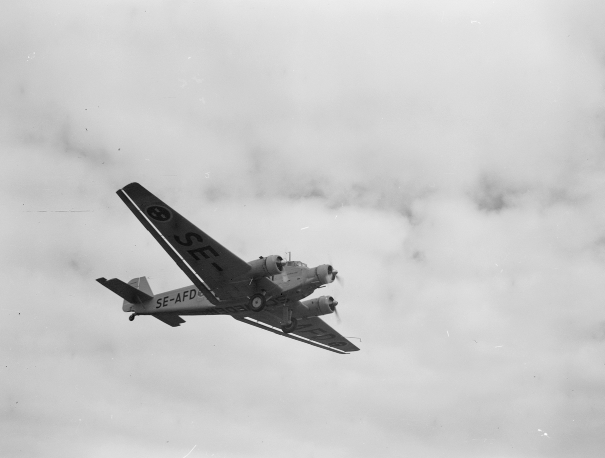 Transportflygplan TP 5, Junkers Ju 52 med registrering SE-AFD Vikingaland i luften. Sett underifrån.