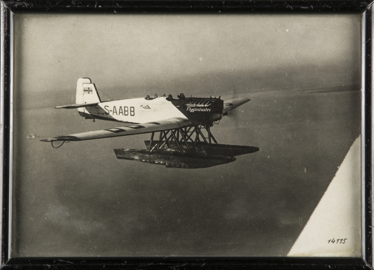 Civilt sjöflygplan Junkers A 35 med registrering S-AABB i luften. Flygplanet tillhörande AB Flygindustri. Inramat foto.