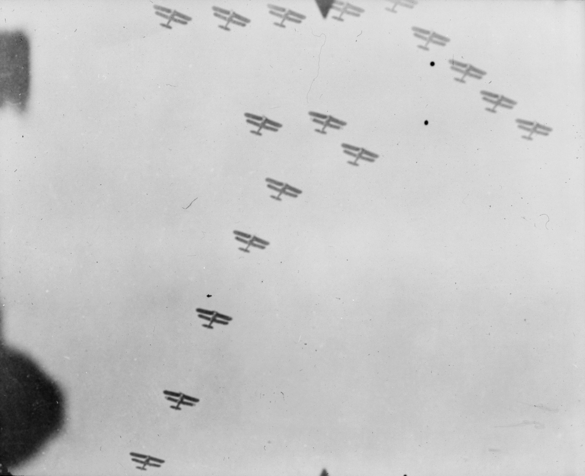 15 stycken flygplan B 4 i formationsflygning i luften. Vy nedifrån.