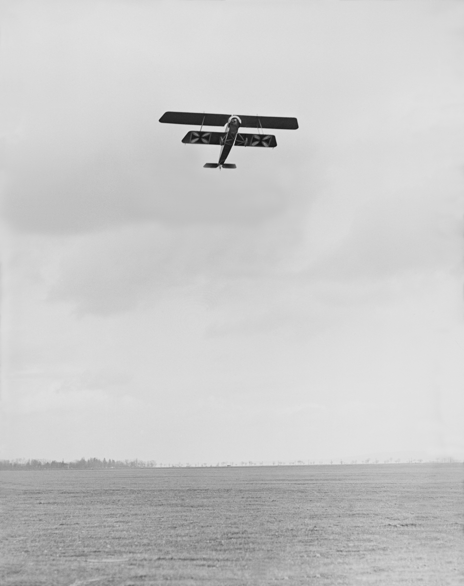 Militärt flygplan Fokker B.I tillhörande Österrike-Ungern i luften över flygfält. Vy snett nedifrån, framifrån.
