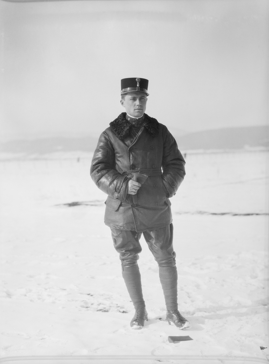 Porträttfoto av militär flygare från Österrike-Ungern på ett flygfält, vintertid. Helbild.