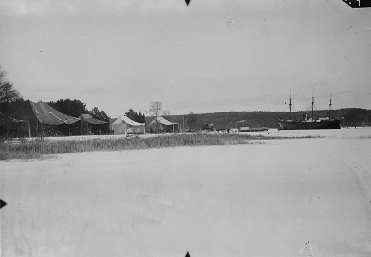 Logementsfartyget Freja i vid Hägernäs flygstation om vintern. På stranden tälthangarer.