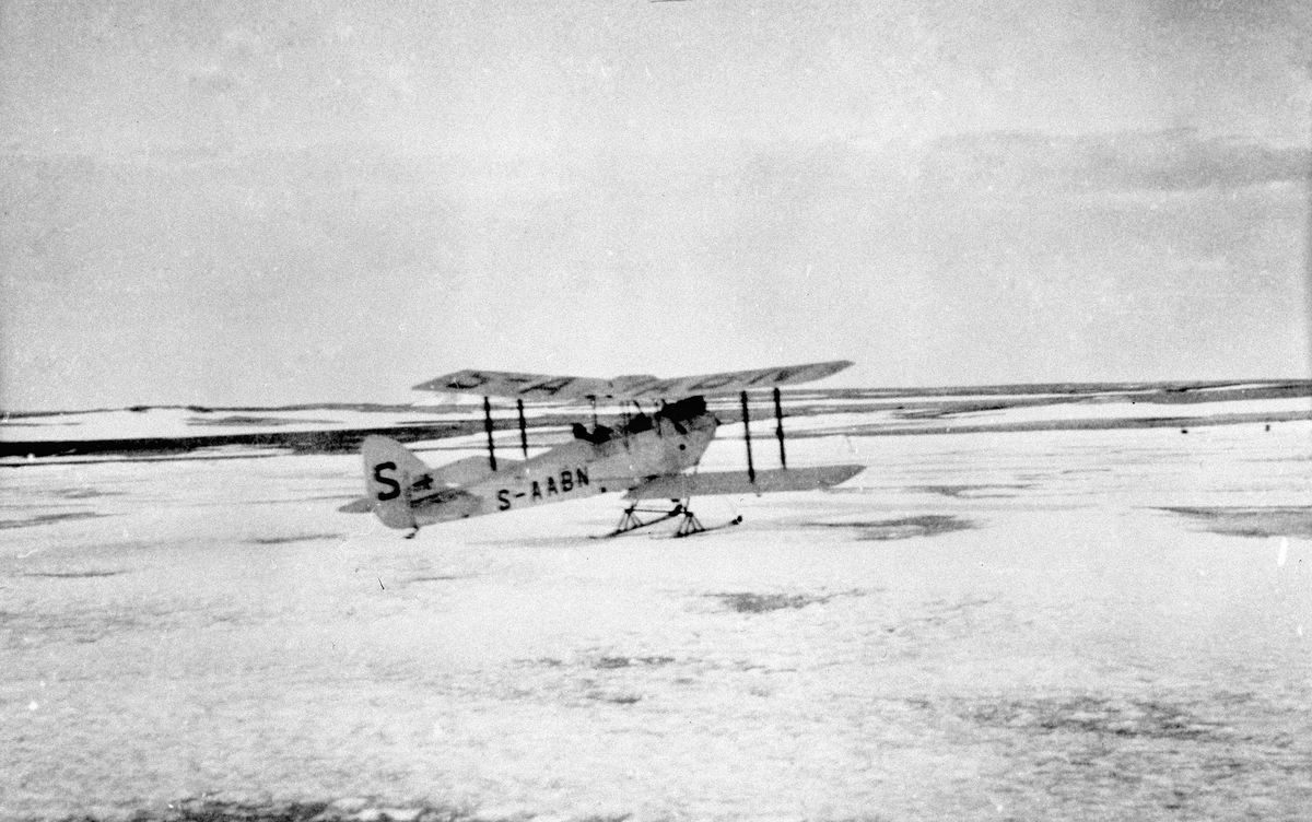 Flygplan de Havilland DH. 60X Moth, civilregistrerat S-AABN, i vinterlandskap. Flygplanet tillhörde Aeromaterial AB och deltog vid undsättningen av luftskeppet Italia på Spetsbergen 1928.