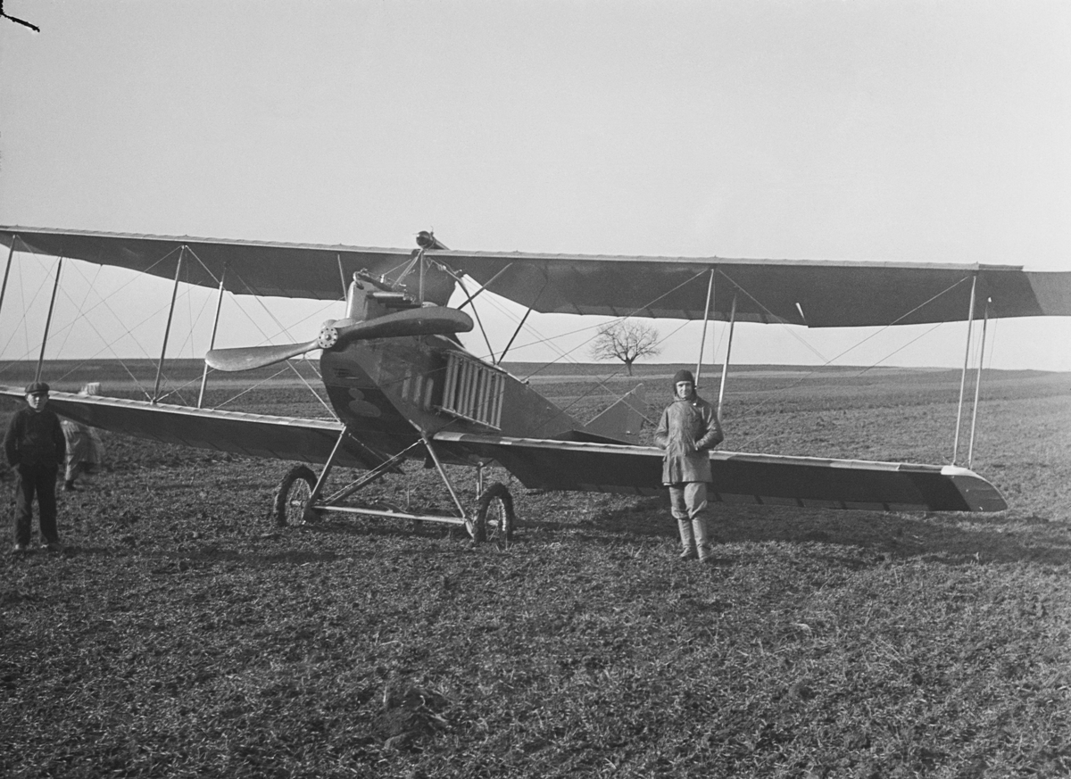 Militärt flygplan Albatros B.I tillhörande Österrike-Ungern står på en åker. Hjulen är nedsjukna i marken. En flygare och ett en pojke står vid planet.