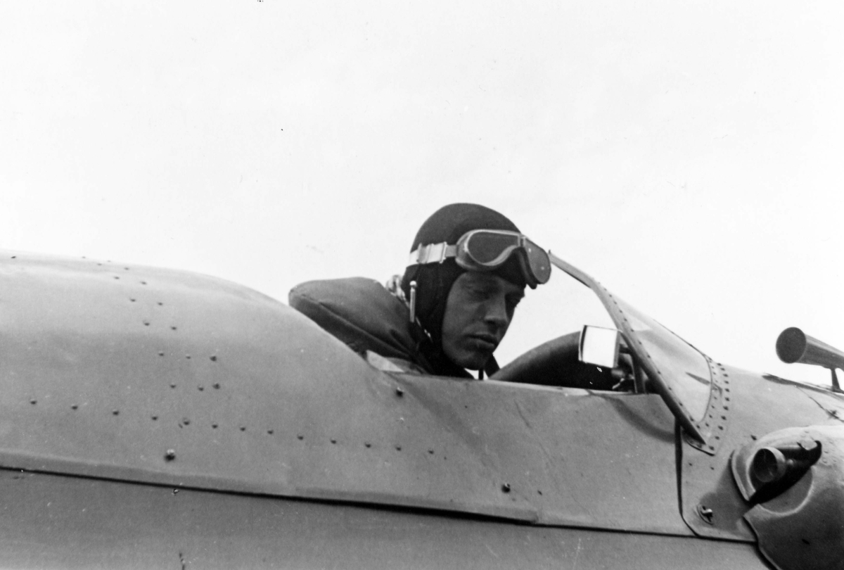 Militäre flygaren Verner Tornberg sitter i ett flygplan. 1930-tal.