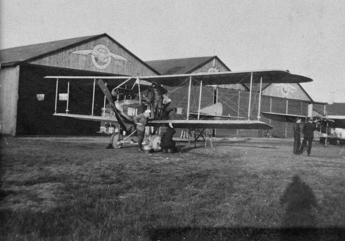 Ett flygplan Thulin C (Albatros SW20) står vid hangarer på Thulins flygskola på Ljungbyhed omkring 1918-1920. Människor i arbete med flygplanet.