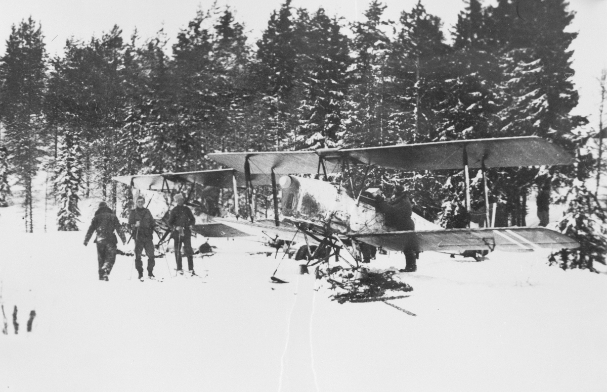 Två norska, nödlandade militära flygplan Tiger Moth på ett fält, vintertid. Militärer i arbete vid flygplanen.