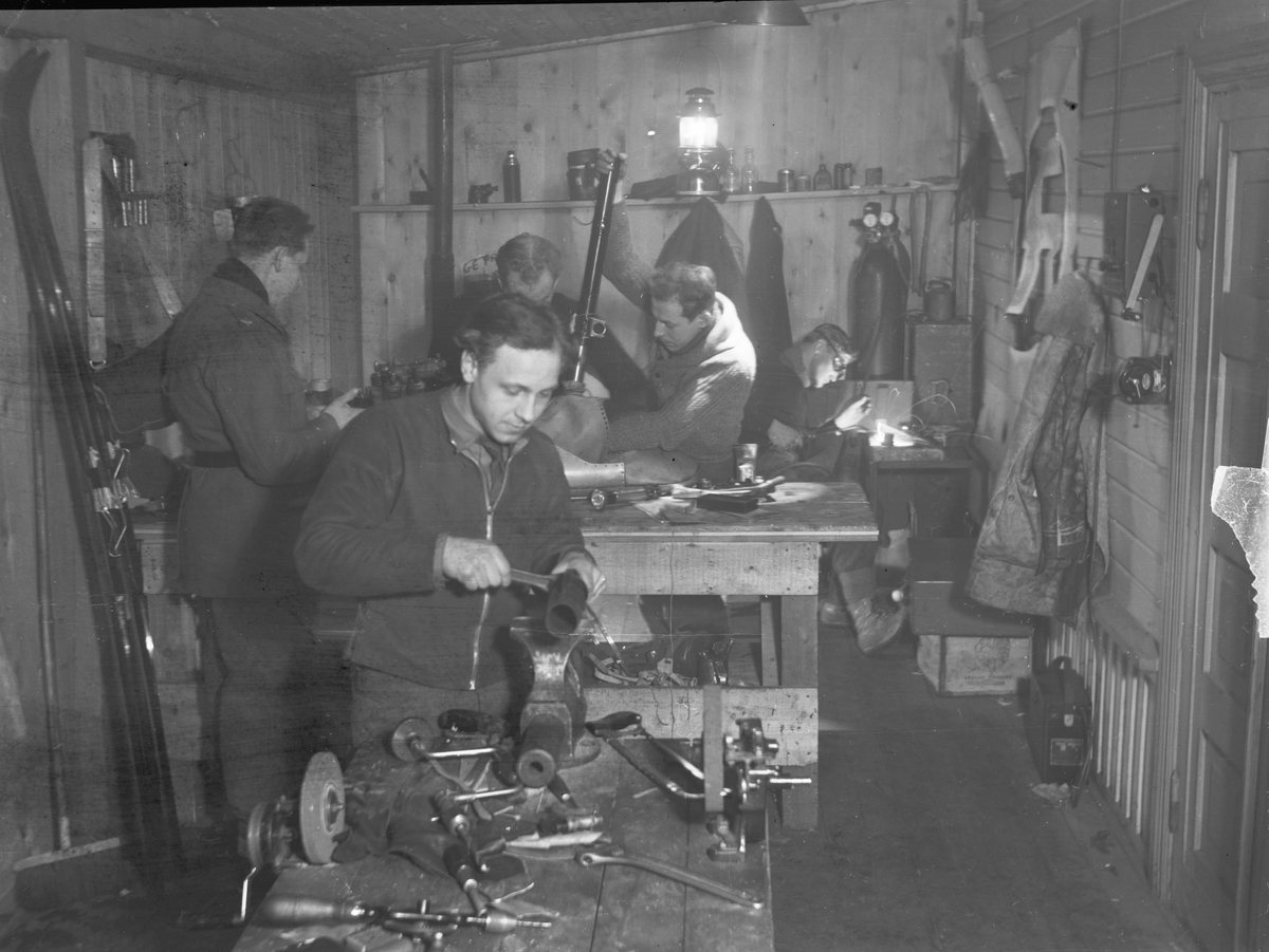 Mekaniker i arbete i verkstaden vid Svenska frivilligkåren i Finland, F 19. Fem militärer i arbete.