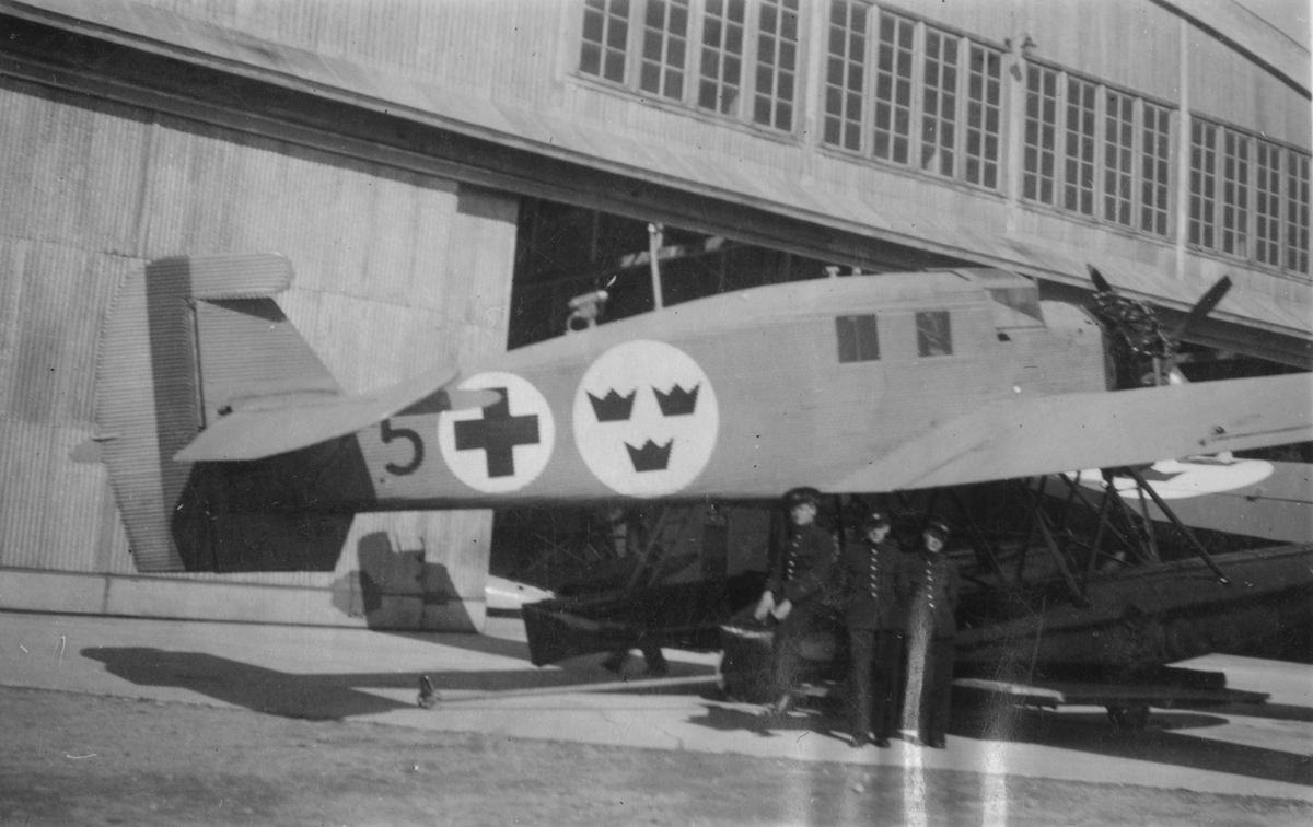 Flygplan Trp 2 framför hangar. Tre militärer vid flygplanet.