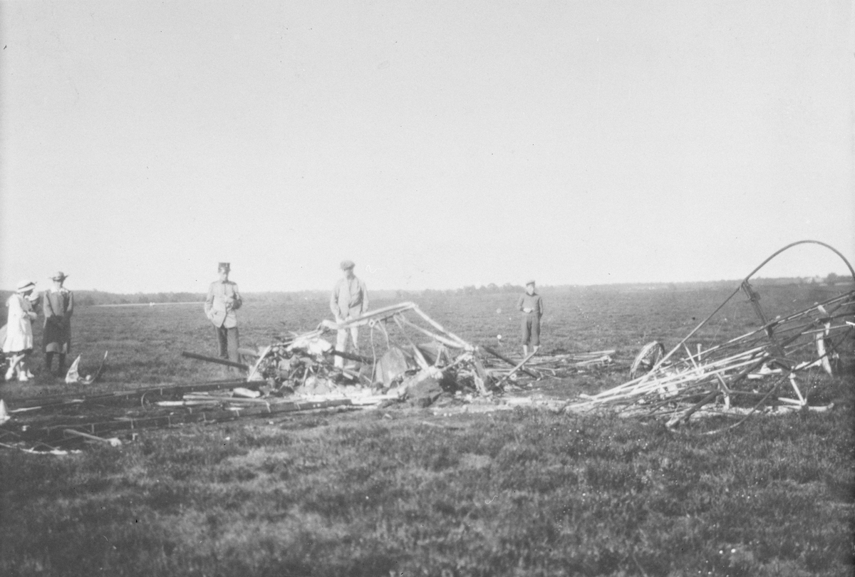 Rester efter ett havererat flygplan Albatros på flygfältet i Ljungbyhed, cirka 1918. Folksamling uppehåller sig vid planet.