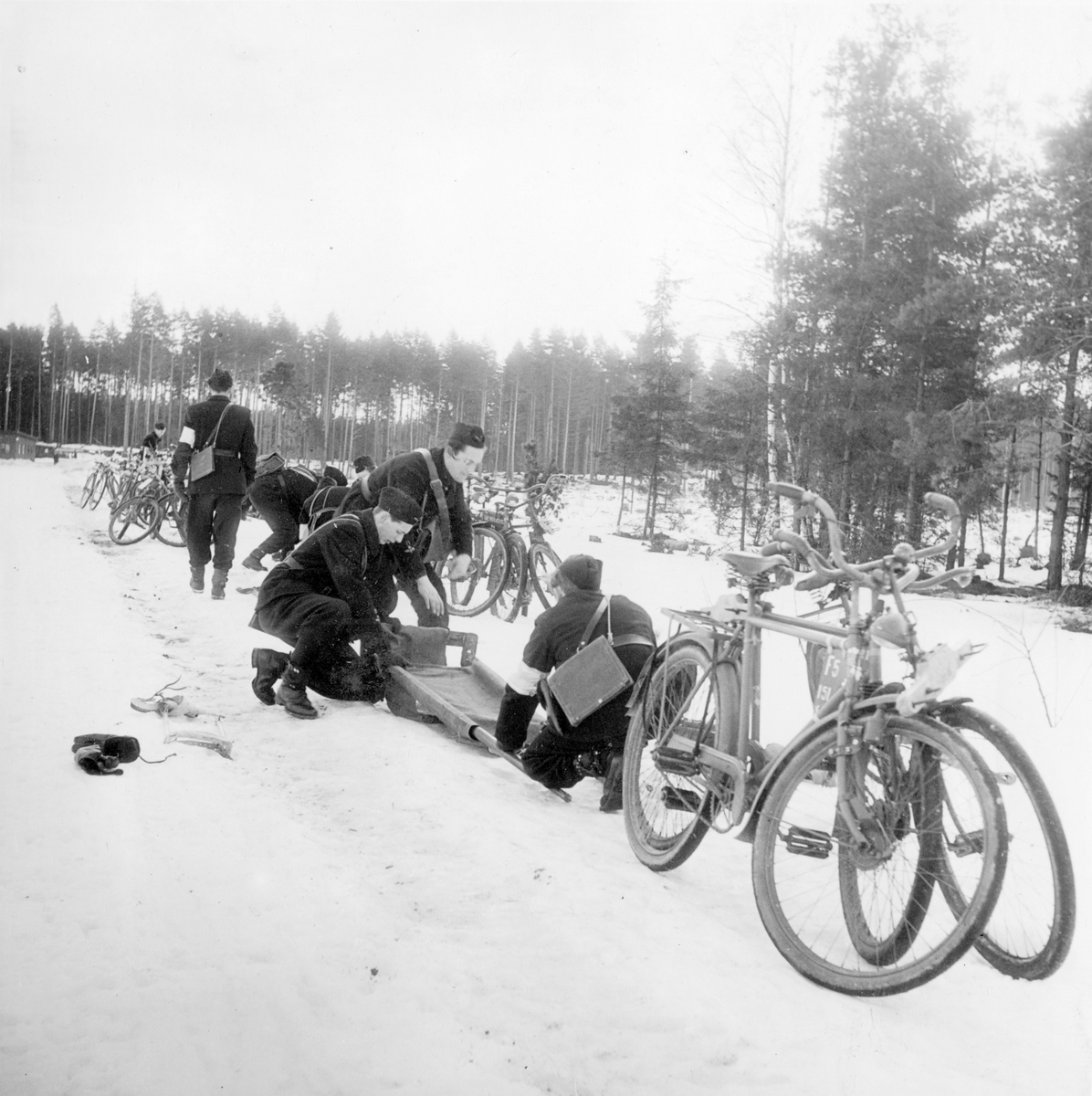 Soldater förbereder räddningsbårar vid sjukvårdsövning i fält vid F 11 Södermanlands flygflottilj, 1945.