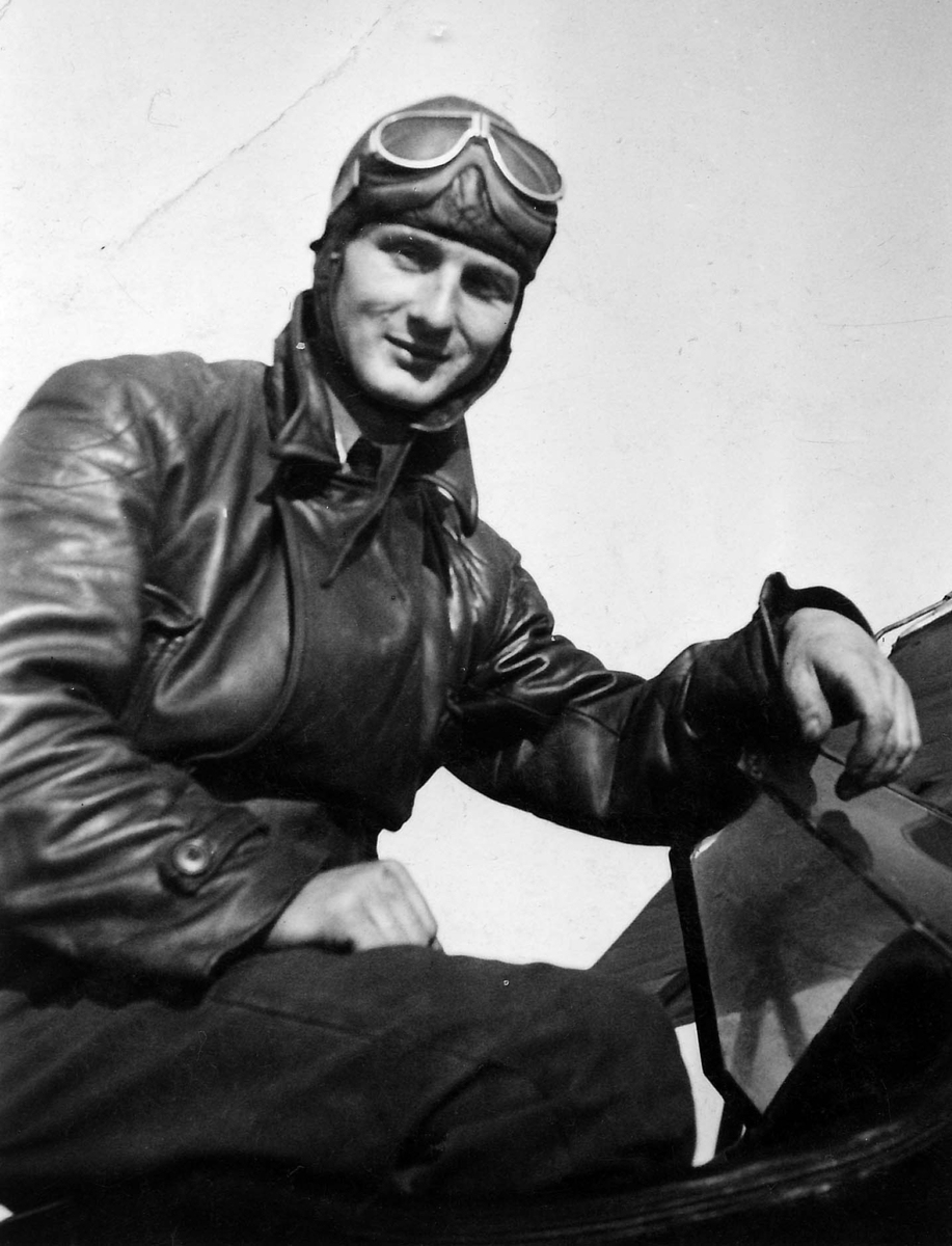 Porträttfotografi av Carl-Gustaf von Rosen vid förarplatsen på ett flygplan, klädd i flygarklädsel, 1930-tal.