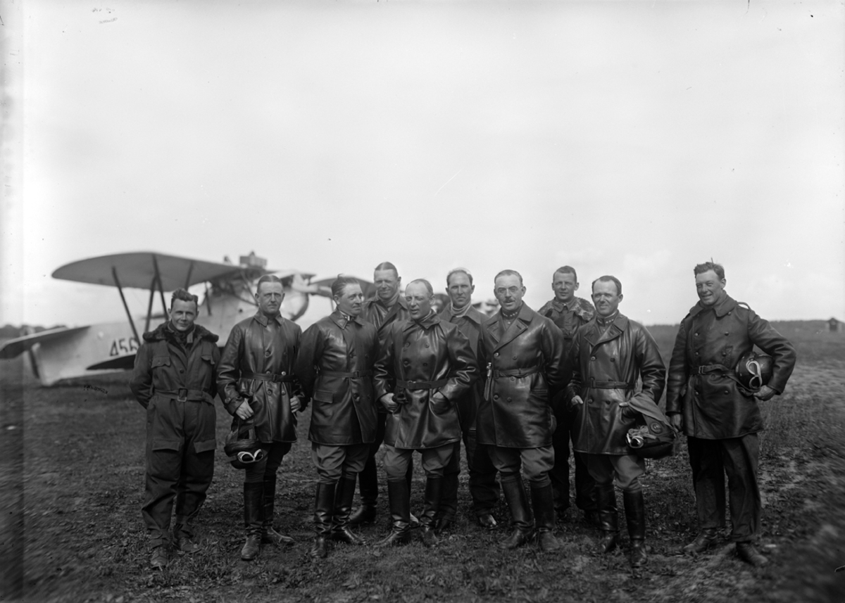 Grupporträtt. Deltagare i generalstabskursen vid Tredje flygkåren, 1928. 10 officerare uppställda på flygfält.