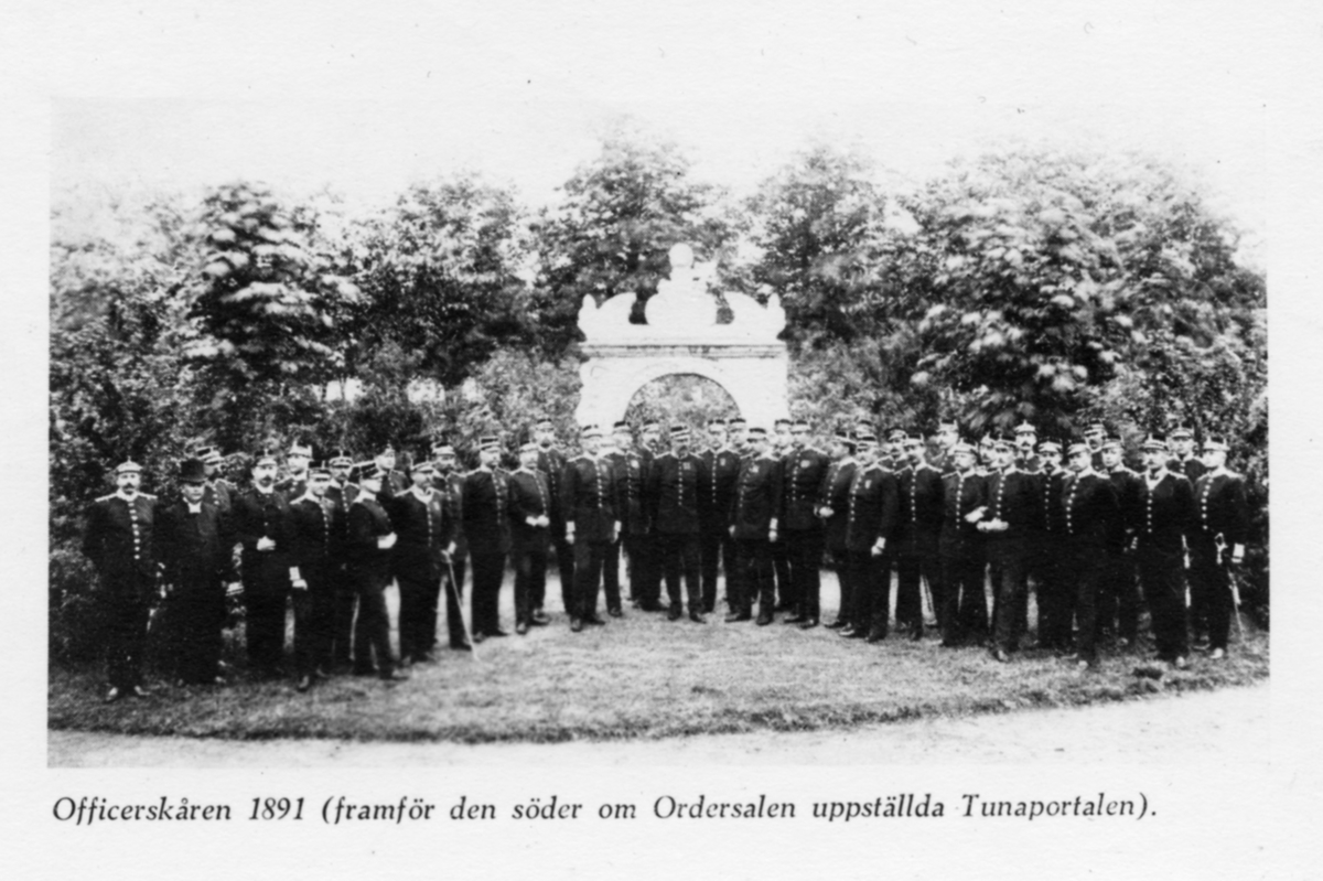 Officerare uppställda för porträtt framför Tunaportalen. Avfotografering av bild ur tryck.
