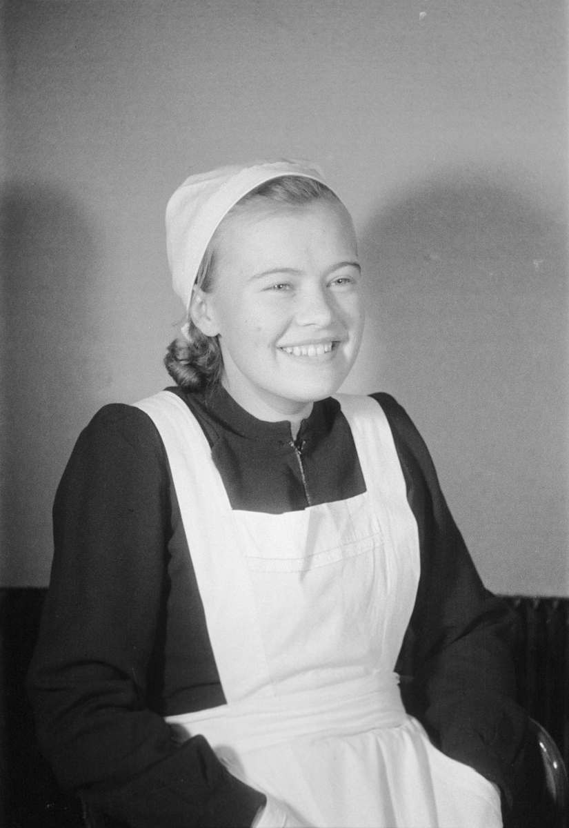 Porträttfoto av fröken Sirkka, finsk lotta vid F 19, Svenska frivilligkåren i Finland under finska vinterkriget, 1940.