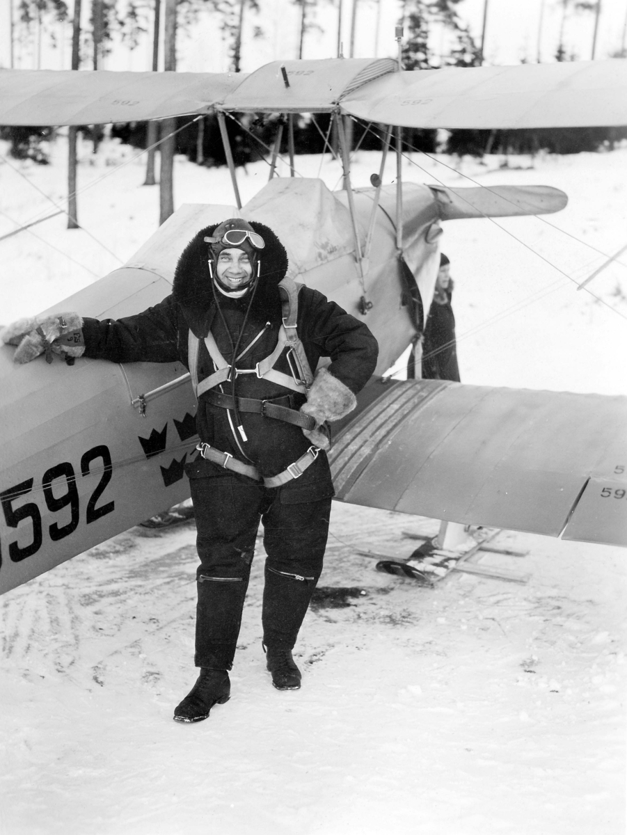 Porträtt av en militär flygare vid flygplan Sk 11, Tiger Moth nummer 5592, vintertid. Cirka 1932-1939.