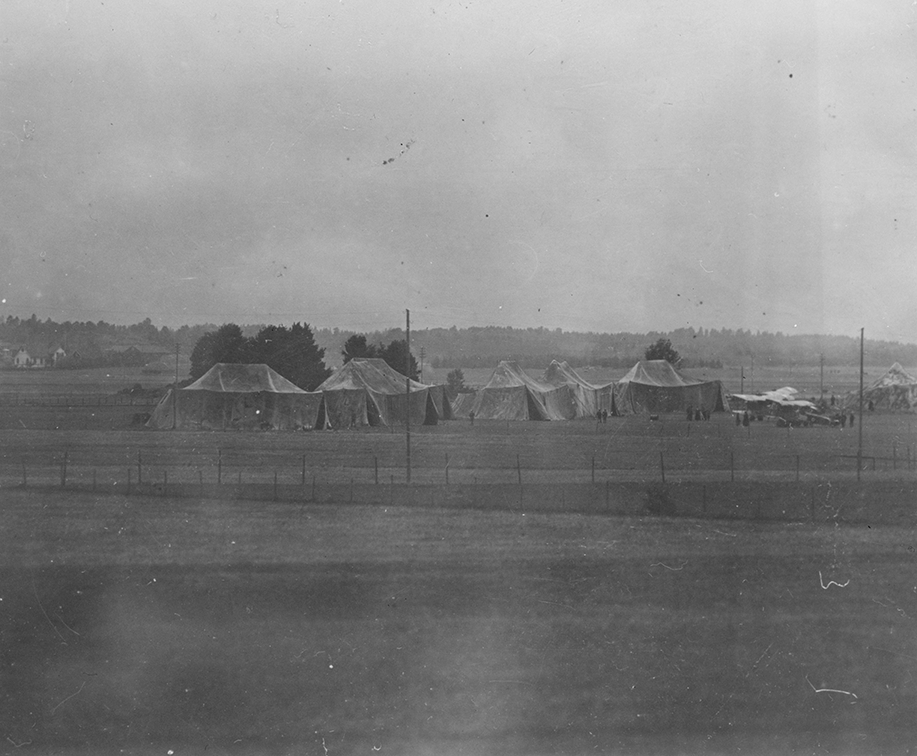 Tälthangarer på ett flygfält samt flygplan FVM S 21, 1920-tal.