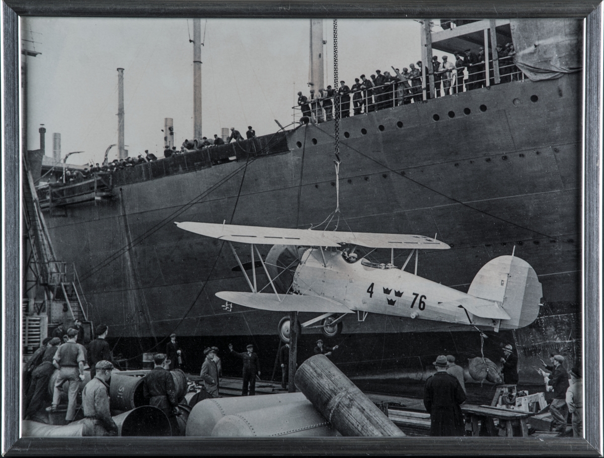 Flygplan B 4 Hawker Hart nummer 4-76 lastas av från fartyg på Götaverken i Göteborg.