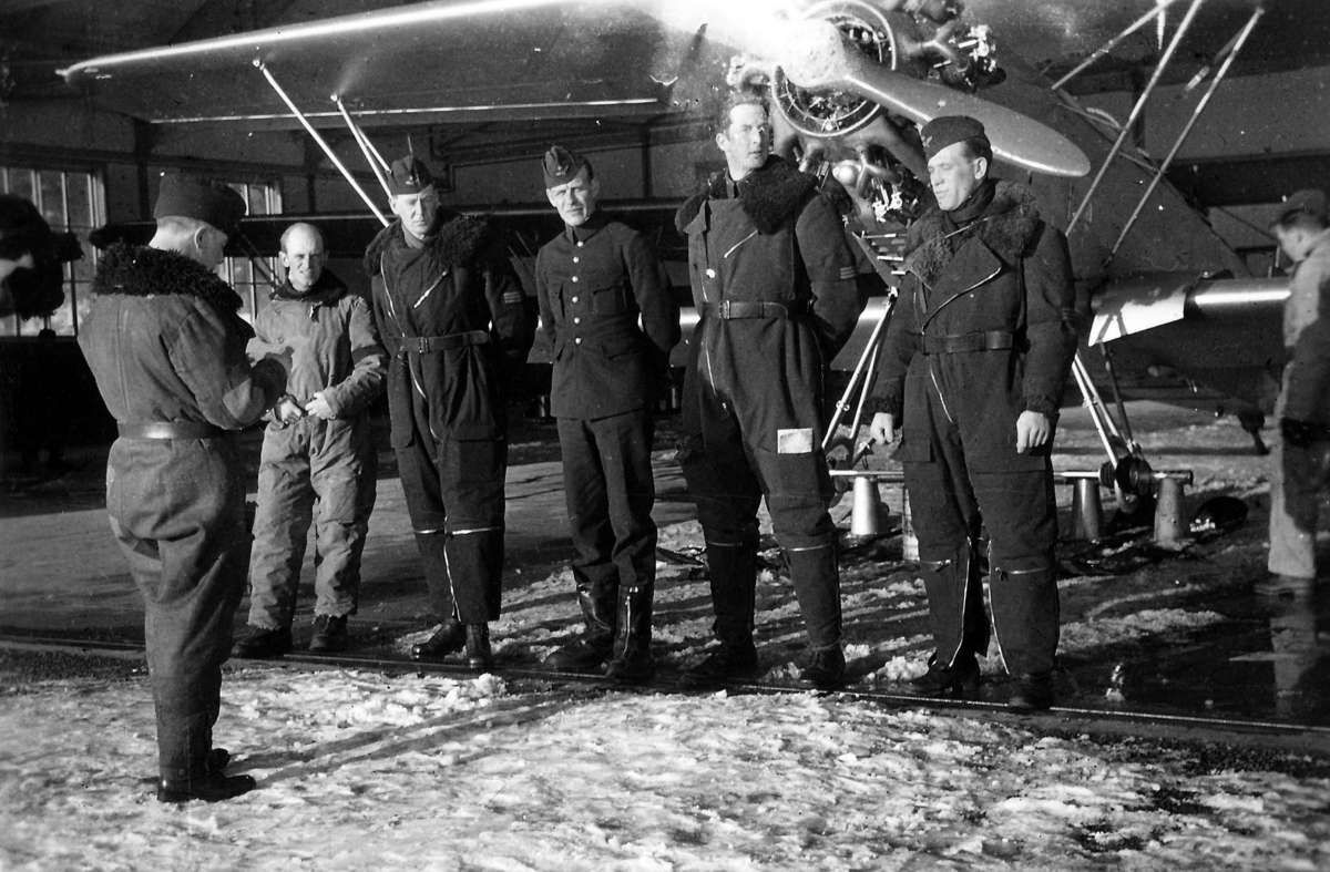 Ordergivning i hangarport framför flygplan S 5 Heinkel He 5 Hansa. En militär i flygoverall föredrar inför flygning framför fem andra militärflygare i en hangarport. Vintertid, 1930-tal.