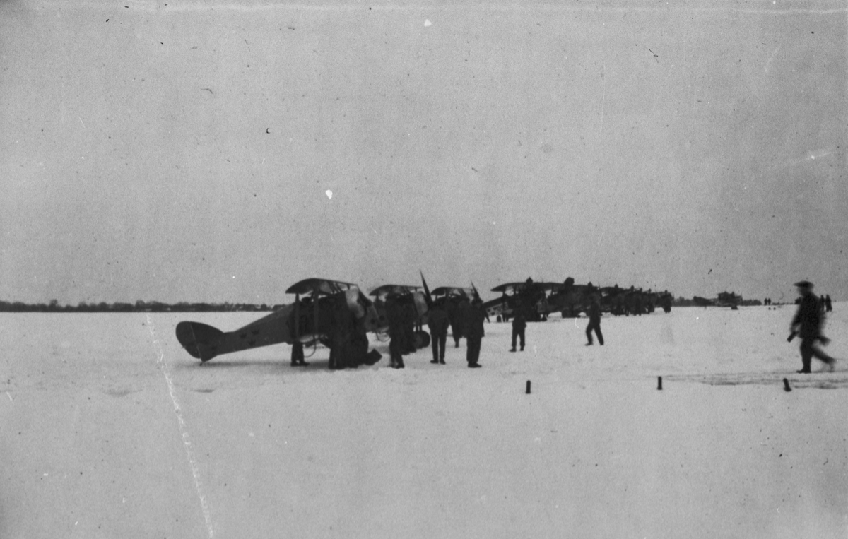 Titel: Flygplan Tummeliten och Albatros står på linje på ett flygfält, vintertid. Militärer i rörelse.